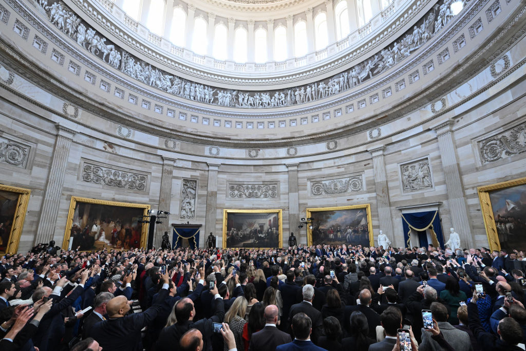 WASHINGTON, DC – JANUARY 20: Guests attend the inauguration of U.S. President-elect Donald Trump in the Rotunda of the U.S. Capitol on January 20, 2025 in Washington, DC. Donald Trump takes office for his second term as the 47th president of the United States. (Photo by Chip Somodevilla/Getty Images) color image,photography,horizontal,usa,office,politics,government,us president,washington dc,guest,inauguration into office,presidential inauguration,politics and government,capitol building – washington dc,donald trump – us president,the rotunda,2025 presidential inauguration of donald trump