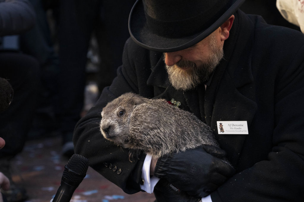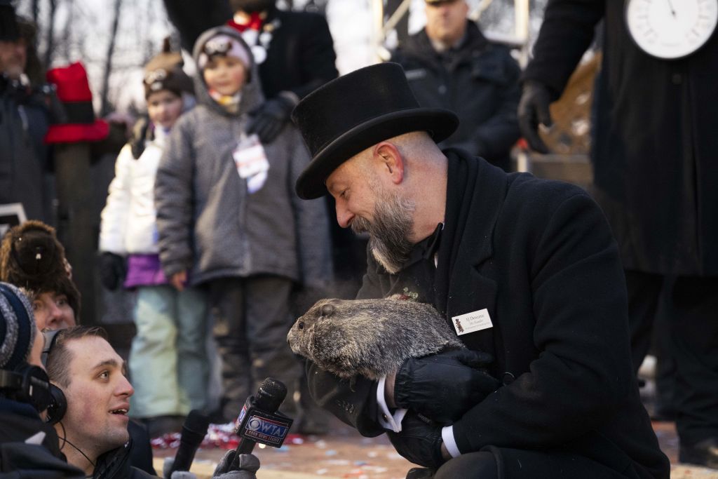 PENNSYLVANIA, UNITED STATES – FEBRUARY 02: Groundhog Club handler A.J. Dereume holds Punxsutawney Phil, the weather prognosticating groundhog, during the 139th celebration of Groundhog Day on Gobbler’s Knob in Punxsutawney, Pennsylvania on February 2, 2025. Phil’s handlers said that the groundhog has forecast six more weeks of winter. (Photo by Mostafa Bassim/Anadolu via Getty Images)